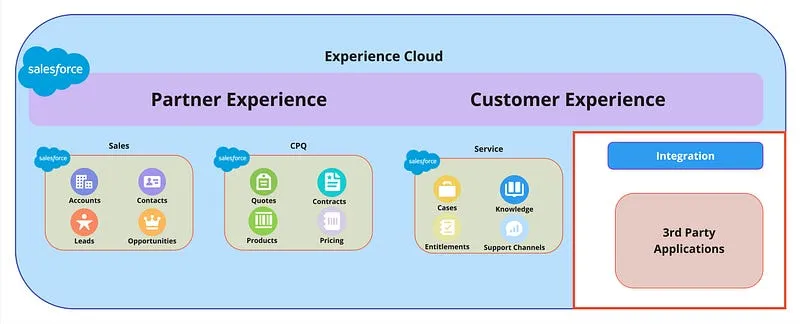 Experience Cloud operates within the Salesforce platform, seamlessly integrating with underlying Salesforce clouds and third-party applications. The architecture encompasses Partner Experience for partner-specific use cases and Customer Experience for end-user interactions.